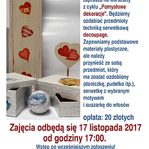 17.11.2017, godz. 17.00 – warsztaty decoupagu, 20zł/os.